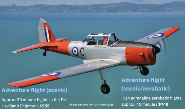 NZ Flying Adventures offer Veterans over the age of 85 the chance of a complimentary flight in a Tiger Moth. All flights are subject to weather. Flights can be arranged for after the Airshow on Friday, Saturday and Sunday and all day Monday. Contact Peter at [email protected] |